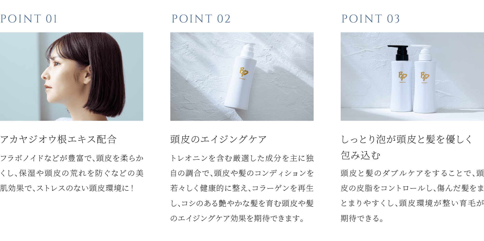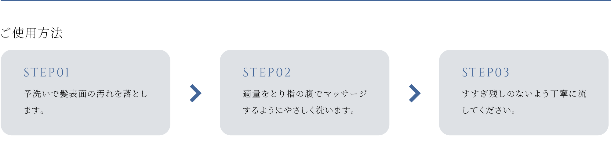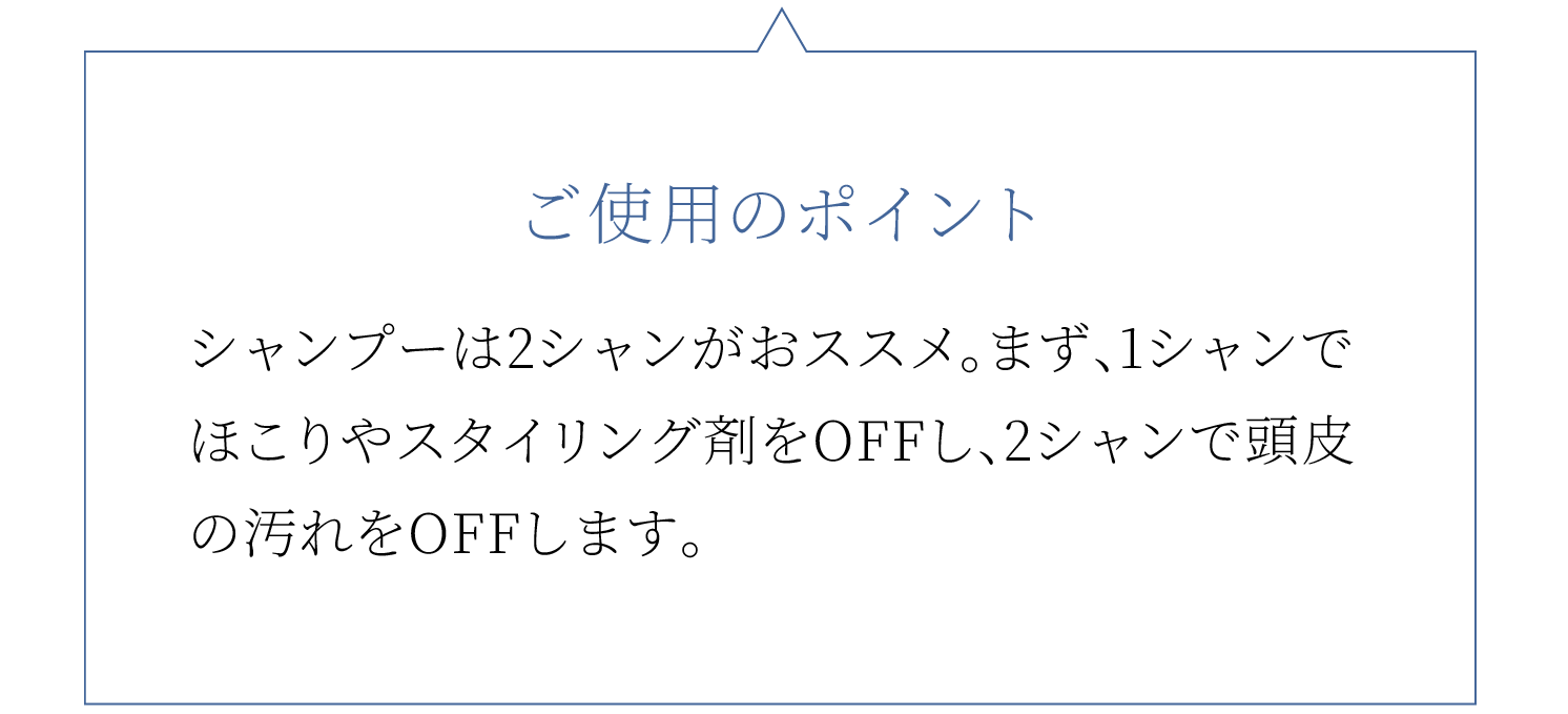 | 使用方法 | 頭皮をマッサージするように優しく洗う |